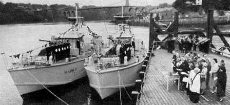 The actual naming ceremony (above) at Menai Bridge Pier, this ceremony being carried out by Madame Tuomioja, wife of the Finnish Ambassador in London. Leaving Menai Bridge on Wednesday 8th May 1957 for the 2000 mile journey to Finland they called at Fowey, Dover then on to Ijmuiden Holland, Towed side by side through the Kiel Canal and after a brief stop over they left Kiel for Kalmar in Sweden on 13th May. The final stage of the voyage ended at Helsinki at 3am on the morning of 15th May. Messrs Saunders Roe had 2 engineers on board through out the journey but other wise both vessels were crewed by Finnish naval personnel.