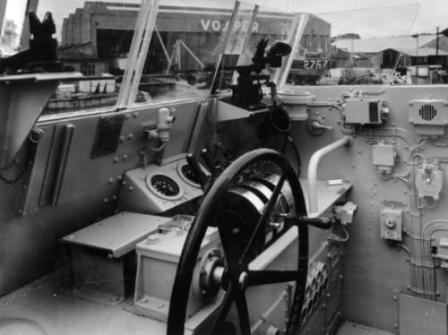 The bridge of a Vosper built craft that has not been positively identified. There were four Vosper built craft and it could be one of any. Those built by Vosper were P1108 Dark Buccaneer (32.6.'54), P1109 Dark Clipper (9.2.'55) P1110 Dark Highwayman, (29.3.'55) P1107 Dark Rover, (30.8.'54). There were 3 Dark class vessels cancelled in 1955. Dark Chaser, Dark Chieftan and Dark Crusader. (Photo courtesy of Ted Else) |