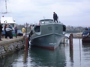 S130 was taken by tug, from the slipway, to the Southampton Boat Show, where a slow sail by was performed. We had supplied the Show organisers with a briefing for the announcers to use, whilst we were passing by. She then went to a berth alongside a pontoon in the Empress Dock, to await a decision on her next move.