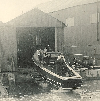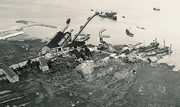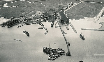 Off jetty - Coaster, ex armed trawler (no funnel but gun tubs on bridge wings) 2 MFVs,