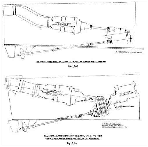 This allows of a half-inch reduction in the diameter of shafting, which assists the general problem of appendage drag reduction. Though the diameter is reduced we are not helped over the matter of critical whirling speeds to meet the problem of which we have to incorporate an intermediate shaft bracket. (See Fig. 18.) |
