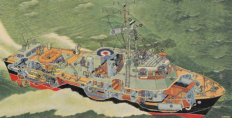 Key to numbered parts: (1) Towing eye. (2) Towing winch and emergency steering position. (3) Starboard engine exhaust. (4) Starboard propeller and rudder. There are three of each. (5) Starboard 500 h.p. Napier Sea Lion engines. There are three. (6) Vee drive to propeller shaft. The centre engine drives direct. (7) Engine room. (8) Rescue float. (9) Fresh-water float. (10) Forward engine-room hatch. (11) Engine-room ventilator. (12) Refuelling hatch. (13) Rescue net. (14) Fuel tanks; 2,250 gallons. (15) Rescue ladder. (16) Cabin air heater. (17) Companion way to below deck, with slides for stretchers. (18) Radio room. (19) Captain's cabin. (20) Officers' wash and toilet. (21) Sick bay with accommodation for five stretcher cases. (22) Galley. (23) Steering control drive. (24) Cot beds (stowed). (25) Crew's quarters. (26) Watertight door. (27) Anchor capstan. (28) Hatch. (29) Crew's wash and toilet. (30) Life-lines. (31) Helmsman in wheelhouse with compass and engine throttle controls. (32) Radar screen. (33) Navigating officer and chart table. (34) Navigating bridge with compass and searchlight. (35) Cage aerial. (36) Sense aerial. (37) Homing aerial. (38) Directional aerial. (39) Very high frequency aerial. (40) Radar scanner. (41) Movable loud-speaker. |