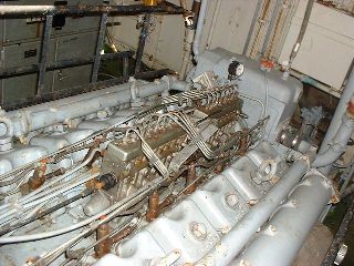 Aft engine room, with one main engine MWM 16 cylinder, looking aft towards shaft tunnel. May 1004