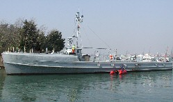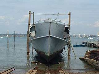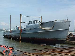The E-boat S130 has been towed from the mud berth at Marchwood, where she has lain for the last one and a half years, to the slipway at Hythe Marine, in Hythe, Southampton, Hampshire England. We discovered that her sea cocks were open, and this explained the majority of water getting into the hull at each high tide. A smaller hull leak was found, which the onboard pump has been able to handle. The boat will be on the slip for about 12 days. We will attend to all underwater problems, and seal the hull for a tow to a yard yet to be announced, for restoration."
