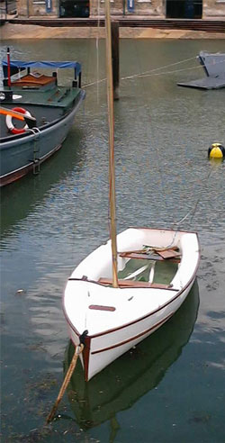 Glass Reinforced Plastic (GRP) She has a glass fibre lay-up consisting of an outer gel coat and glass matting impregnated with resin. The foredeck and side seating section is bonded to the hull and she has mahogany thwarts, gunwales, rubbing strake and stem piece. She has a galvanised steel drop keel and detachable rudder. |
